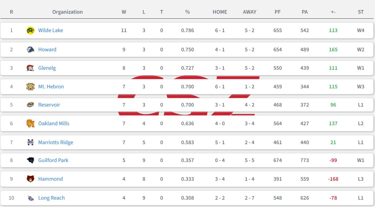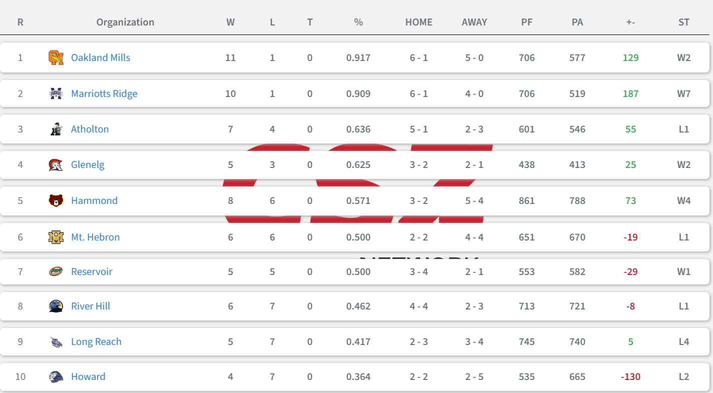 Friday’s schedule includes exciting matchups as teams look to rise in the standings. 7-4 Oakland Mills hits the road against 8-3 Reservoir and 8-3 Glenelg travels to Marriotts Ridge. The winners of these games could propel themselves into or stay in the top 5.